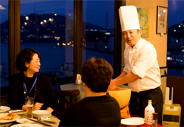 門司港駅から程近く。北九州市門司区西海岸の景色がいいイタリアン「展望レストラン 陽のあたる場所(ひのあたるばしょ)」。近隣のお客様はもちろん、ご観光の際のお食事処としてもご愛好いただいております。お越しいただく度に様々な 表情を見せる当店。陽の光が差し込むランチには、ぜひ名物の“焼きカレー”をお試しください。夜景が楽しめるディナータイムはその雰囲気が一変し、落ち着きと安らぎの空間で上質なイタリア料理の数々をお楽しみいただけます。大人数のパーティーや結婚式の二次会など、各種イベントも承っておりますので、どうぞその時々の 楽しみ方で、当店の夜を満喫してください。